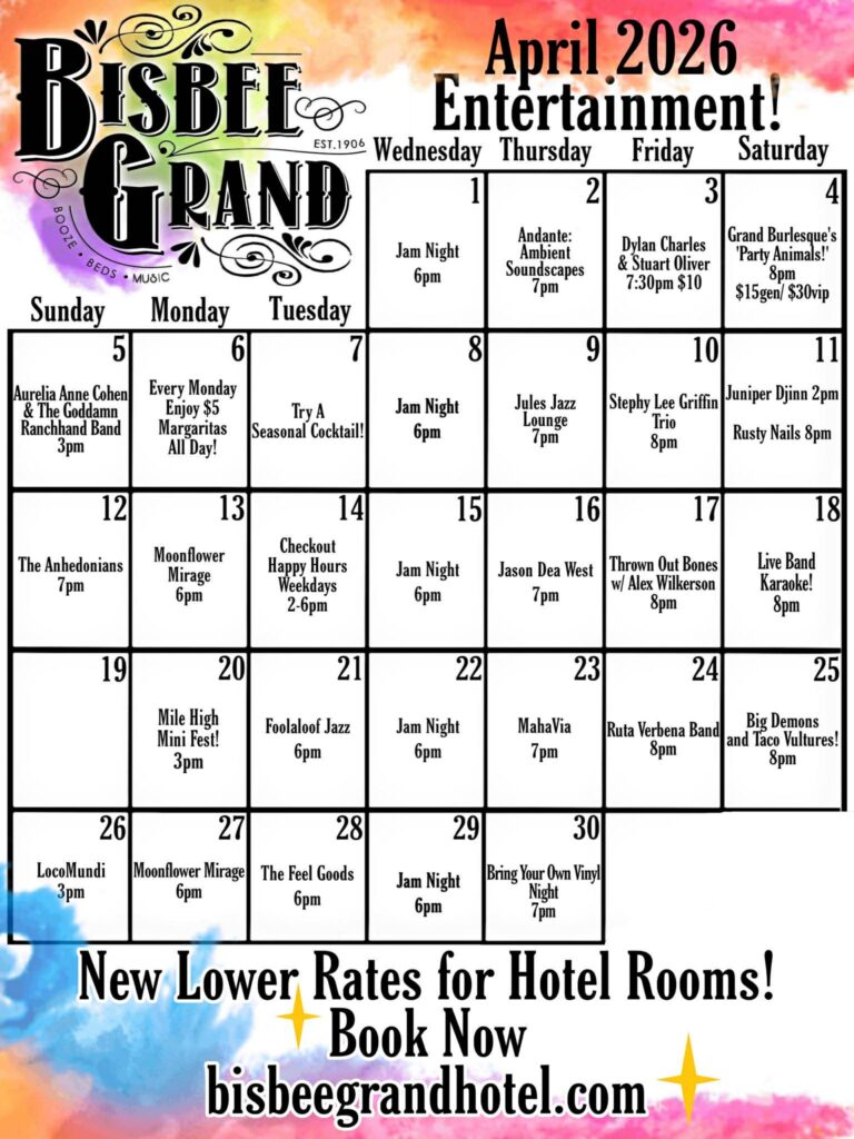 Find monthly Bisbee event calendars here to plan your Bisbee Arizona adventure ahead? Here are the latest event calendars for many of our fine Bisbee entertainment venues.