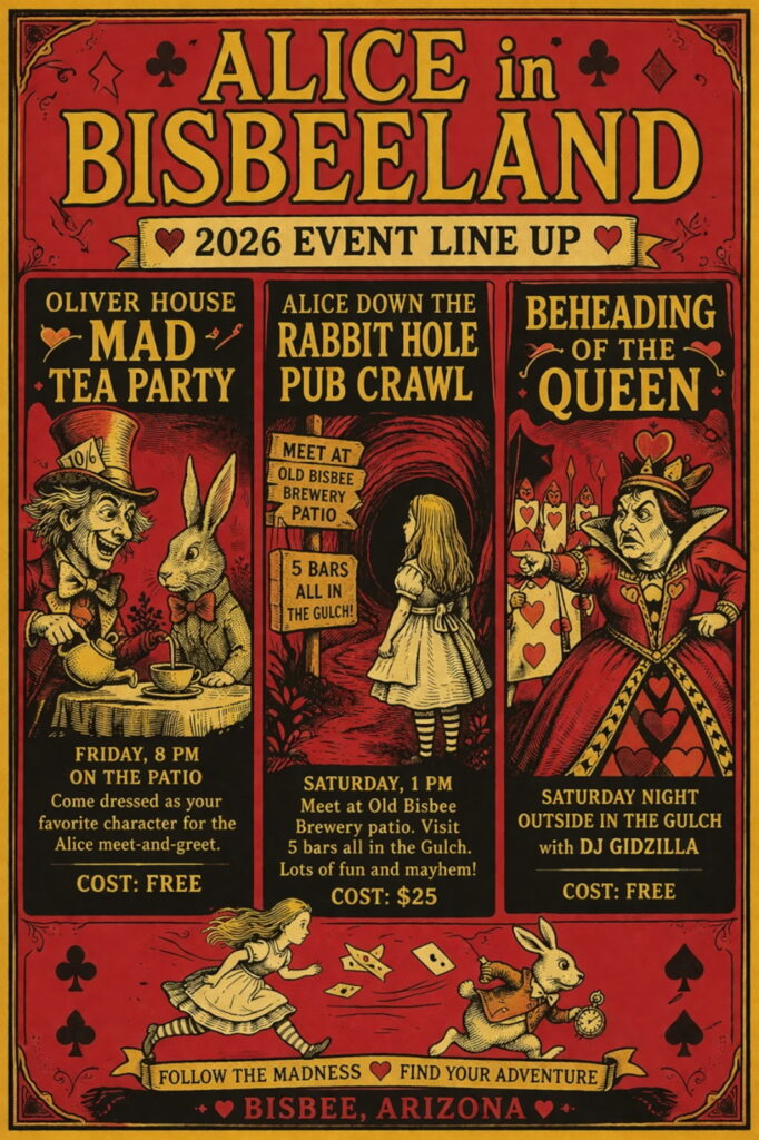 Alice in Bisbeeland Pub Crawl 1pm meet at Old Bisbee Brewing – going to 5 bars – $25 – lots of fun and mayhem!