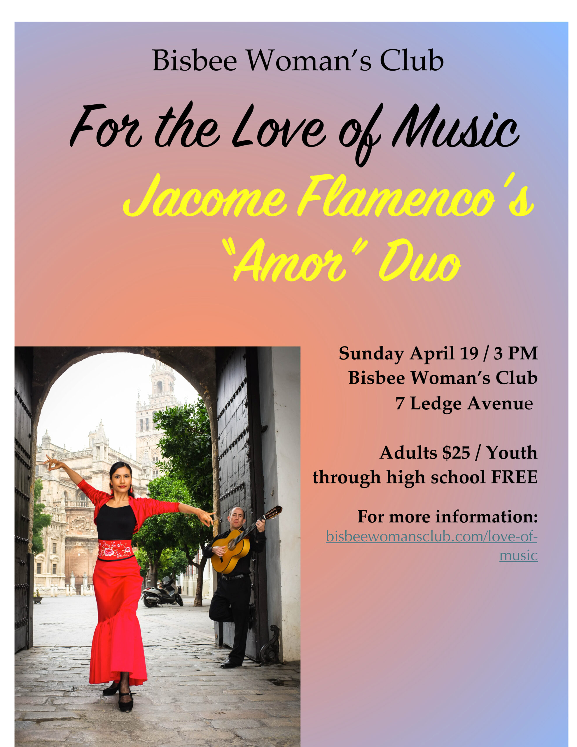 Bisbee Woman’s Club presents: For the Love of Music 3pm 7 Ledge Ave Jacome Flamenco’s “Amore Duo” $25 – kids thru high school, free.