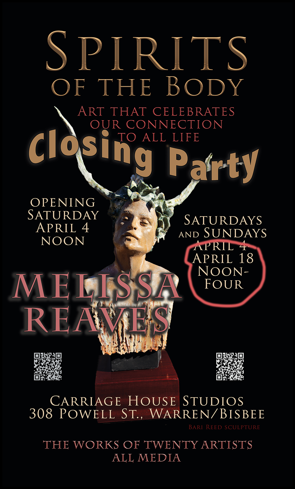 Spirits of the Body at Carriage House Studios, 308 Powell St., Warren/Bisbee. Twenty renowned artists bring sculptures, paintings, photographs, collages, and multimedia work that celebrates our connection to all life. Closing party with Melissa Reaves noon – 4pm
