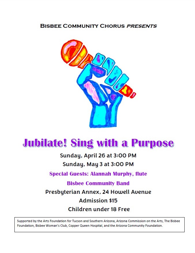 Join your friends and neighbors for an afternoon of three-part harmony as the Bisbee Community Chorus presents its spring concert. The Chorus sings classic choral pieces, a folk song, a Broadway tune, and several pop songs from the 70s. Concerts will feature award-winning flutist Alannah Murphy and the debut of the Bisbee Community Band. Two performances: Sunday, April 26 and again on Sunday, May 3. Concert hall is at 24 Howell Ave., in Old Bisbee, just up the street from the Copper Queen Hotel. Show time is 3 pm both days, and tickets are $15, with kids and teens free.