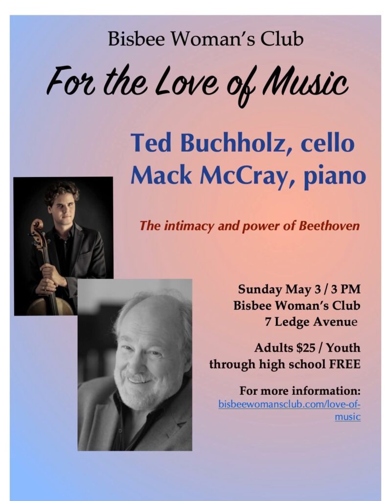 An all-Beethoven concert will be the season’s last event in the For the Love of Music chamber music concert series, hosted by the Bisbee Woman’s Club, 7 Ledge Avenue at 3pm. Adults $25, students through high school admitted free. Online tickets available at https://www.zeffy.com/en-US/ticketing/for-the-love-of-music