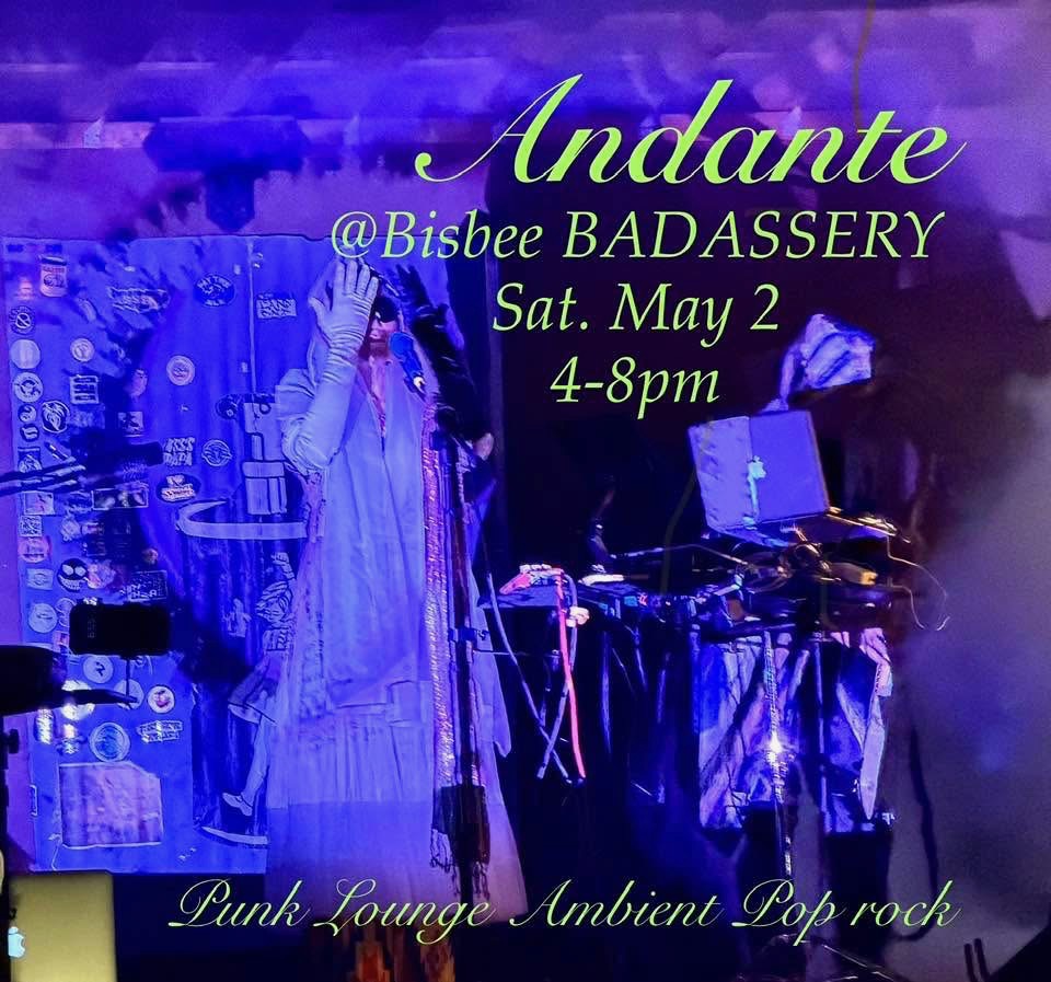 Andante at the Bisbee Badassery from 4-8pm. Frank Tornoe and Carolyn Toronto playing punk lounge & ambient pop rock with a psychedelic light show after dark!