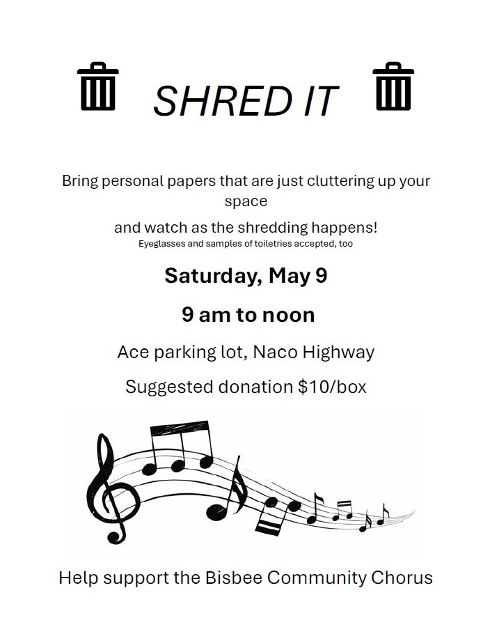 Have some personal papers you want to see shredded? Old tax info, credit card and bank statements, medical records? Bring them to the Shed-It/Shred-It event on Saturday, May 9 from 9am to noon at the Ace parking lot on Naco Highway. This is a regular fundraiser for the Bisbee Community Chorus. The suggested $10 per box donation pays for the cost of getting the shredding truck to Bisbee, with the remainder of the donation supporting Chorus expenses. Volunteers will unload for you and also accept eyeglasses for recycling and samples of toothpaste and toiletries to pass on the local shelters. Sorry – no electronics or meds.