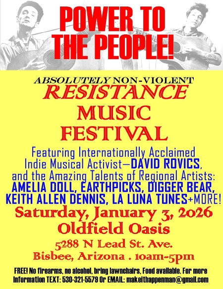 Seeking performers for a Protest Music festival January 3, 2026 at OldField Oasis. Same people who hosted Chiricahua “Get Up Stand Up” Festival in Rodeo last May. we are looking to add to our list of performers. The event will be held at Luke Oldfield’s property at 5288 N Lead St Ave. Interested performers should contact Scott at 530-321-5579 (text is best) or makeithappenman@gmail.com.