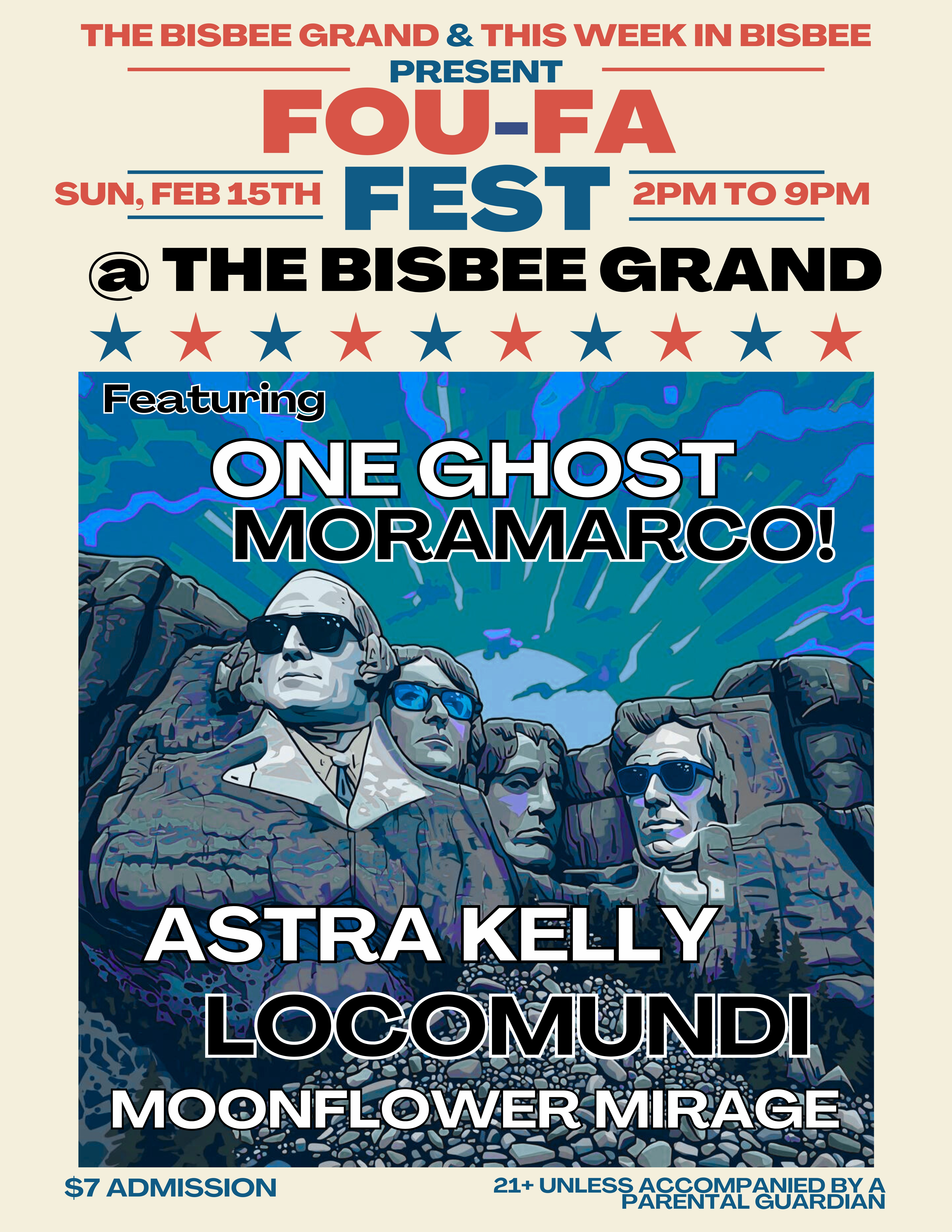 Fou-Fa Fest! at Bisbee Grand Hotel 2pm – 9pm A celebration of our Fou-Fa (Founding Fathers) – but really just an excuse to have a bunch of bands. at the Grand! $7 gets you in – support the bands. Moonflower Mirage/Fatigo 2 – 3:30 Locomundi 3:45 – 5:15 Astra Kelly 5:30 – 6:30 Moramarco! 6:45 – 7:45 One Ghost 8 – 9pm