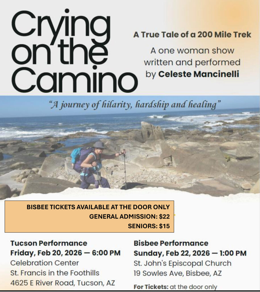 The performance will take place at St. John’s Sweet Parish Hall, 19 Sowles Avenue in Bisbee, on Sunday, February 22nd at 1:00 pm. General Admission $22. Seniors $15. Part of the proceeds will be used to support Parish Hall maintenance and upgrades.