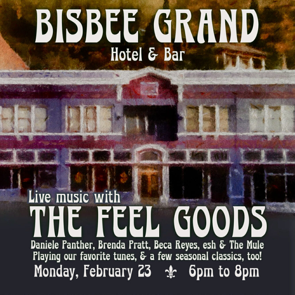 The Feel Goods at Bisbee Grand Hotel 6pm – 8pm Daniele Panther, Beca Reyes, Brenda Pratt, Esh and the Mule