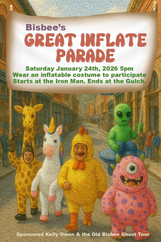Bisbee’s 1st Annual Great Inflate Parade at Iron Man Bisbee 5pm This whimsical, one-of-a-kind event invites you to wear your most outrageous inflatable costume and take to the streets of historic Old Bisbee. Watch as a parade of giant dinosaurs, unicorns, aliens, and other puffed-up characters float and bounce their way down Main Street, ending in a joyful celebration at Brewery Gulch. Whether you’re marching or just watching, this lighthearted spectacle is pure Bisbee magic — colorful, creative, and just a little bit weird. Participation rule: An inflatable costume is required to join the parade. So fill it, zip it, and get ready to inflate your fun! *this is not a political parade*