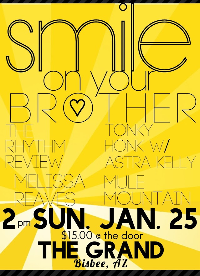 Smile on Your Brother 2pm – 5pm Benefit for Timothy Dick w/Melissa Reaves, Astra Kelly, Tonky Honk, The Rhythm Review, Mule Mountain $15 Bisbee Grand Hotel