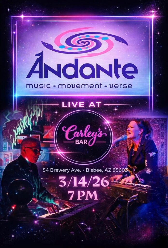 Jam Night at the Bisbee Grand 6-10ish – bring your ax, sticks, and picks, and play with a gaggle of Bisbee’s best musicians but players of all levels are welcome and encouraged to sign up for a 20-minute slot. Full drum kit, keyboard, and amp backline (usually a guitar and bass you can borrow, too).