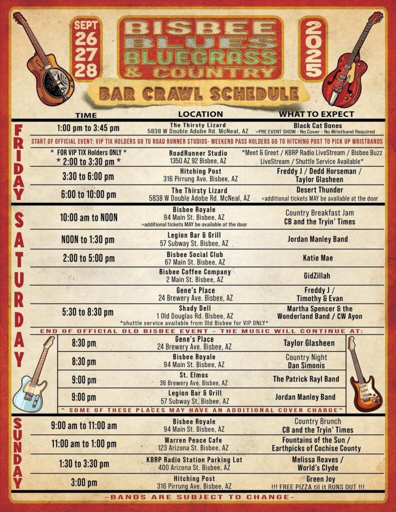 Feel free to save, print, or share. All shows are subject to changes or cancellations for no apparent reason – hey, it’s Bisbee!