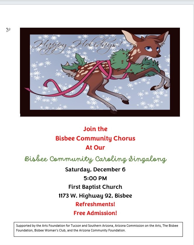 Bisbee Community Chorus Holiday Singalong – Saturday, Dec.6, 5pm, First Baptist Church, 1173 W. Highway 92