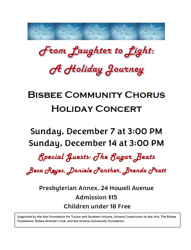 Bisbee Community Chorus Winter Concerts – Sunday, Dec. 7 and Dec 14, 3pm, Presbyterian Annex, 24 Howell, Old Bisbee