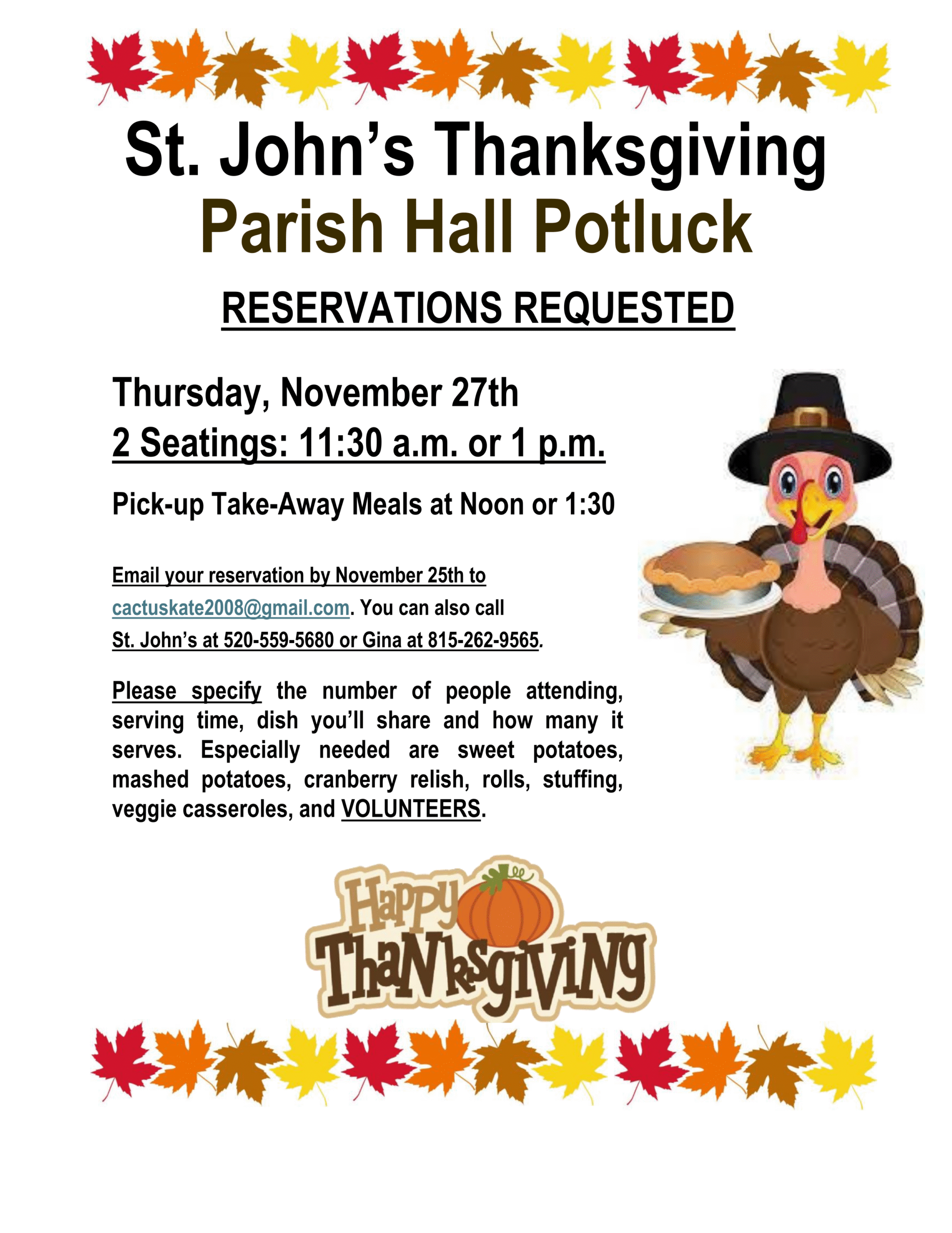 Thanksgiving at St. John’s Episcopal Church Bisbee Contact Gina at cactuskate2008@gmail.com for reservations or to volunteer. 2 seatings 11:30 am and 1 pm